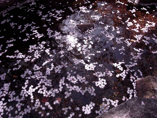 前日の雨で花はすでに散り始め、水面は桜色にそまっていた。