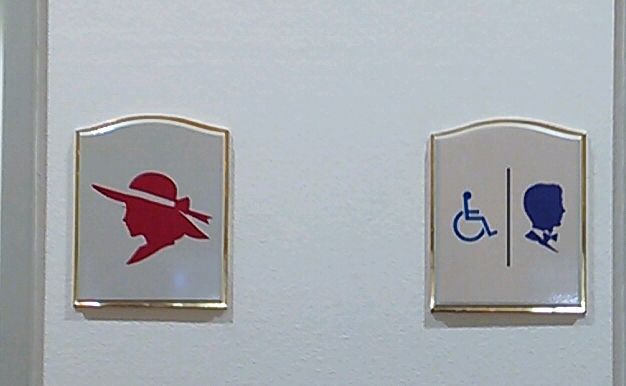 男性用小便器の向かいにならぶ個室のひとつに「車椅子マーク」がついていたりする。