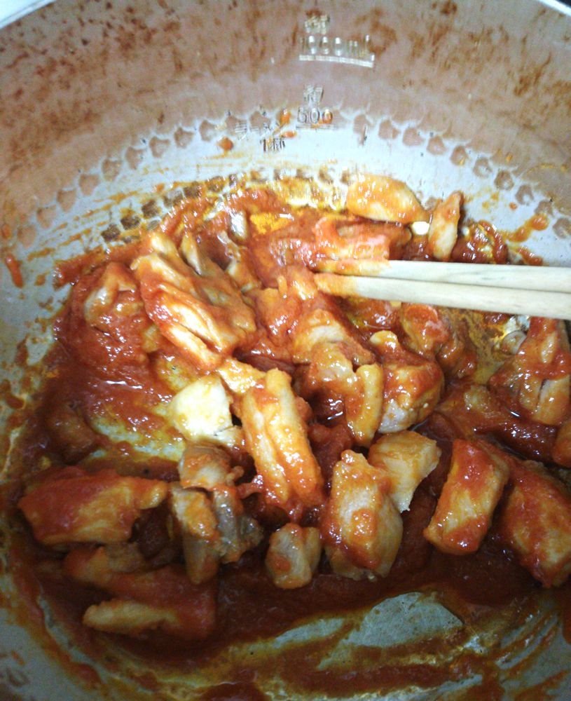 「チキン」って書いてあるので、チキンをストリップさせた鶏の生肉を炒めた!