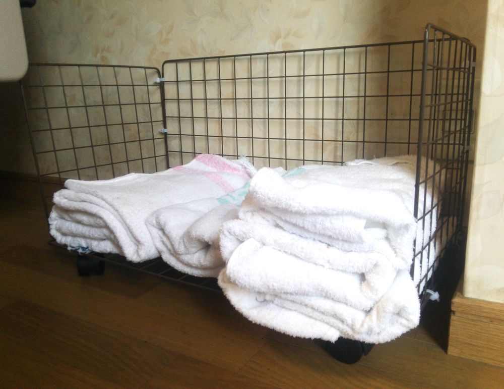 車椅子のタイヤを拭いたり、猫を拭いたりする雑巾を入れる籠。