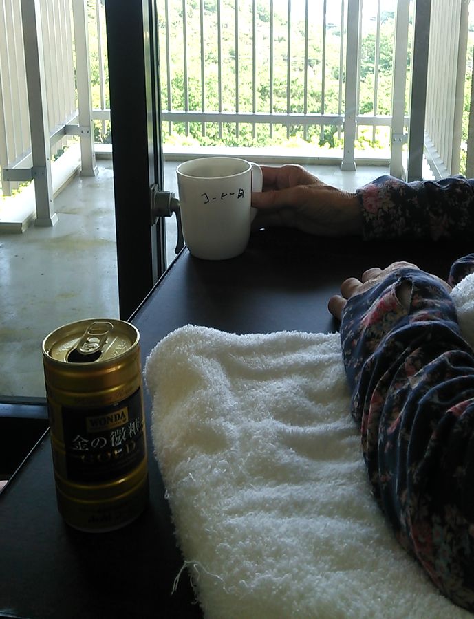 近頃は車いすに上手に座れるようになったので、今日ははじめて病院の喫茶コーナーへいってコーヒーを飲んだ。