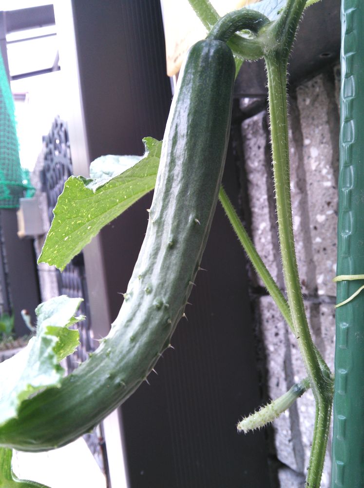愛しのキュウリさんは残念ながらうどんこ病にやられまくっているが、それでも一応、実がなってる。